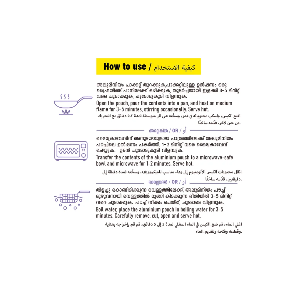 Boiling Method: Immerse unopened pouch in boiling water for 3–5 minutes.