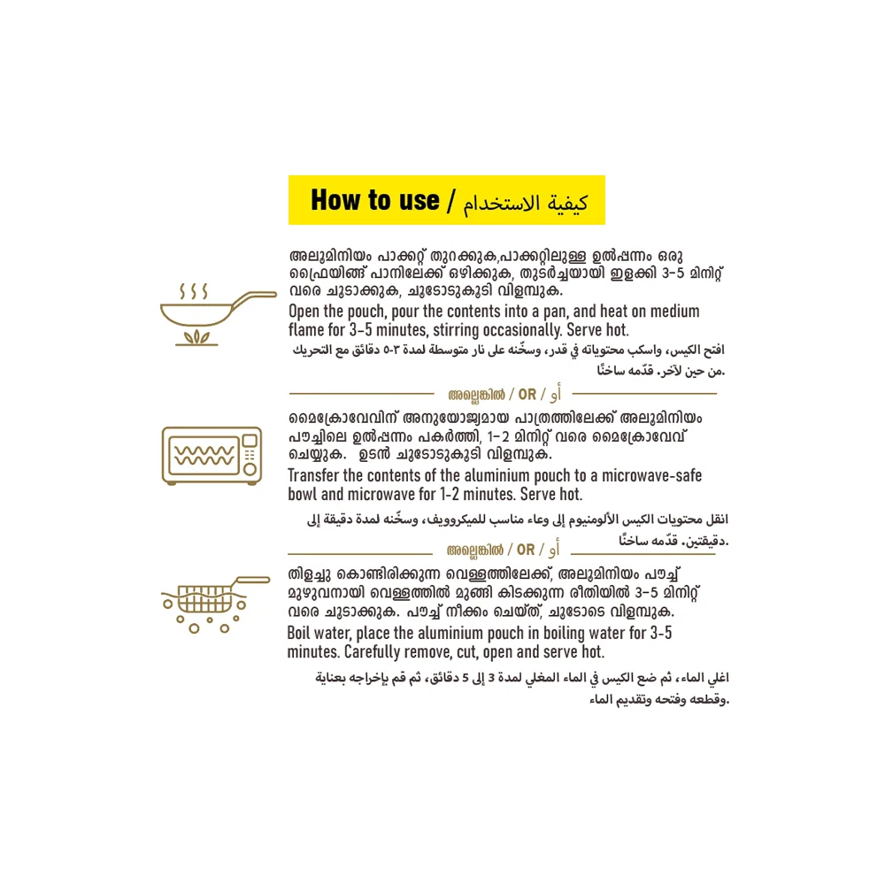 Boiling Method: Immerse unopened pouch in boiling water for 3–5 minutes.
