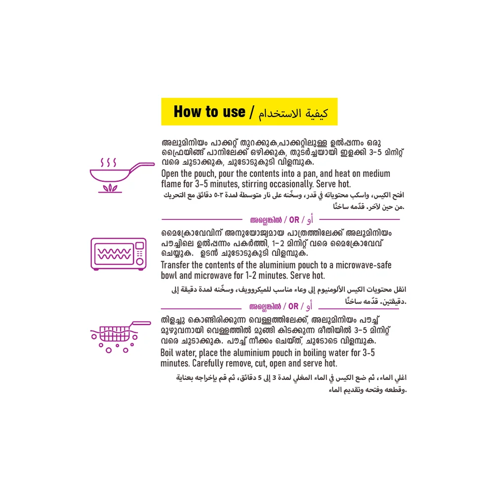 Boiling Method: Immerse unopened pouch in boiling water for 3–5 minutes.